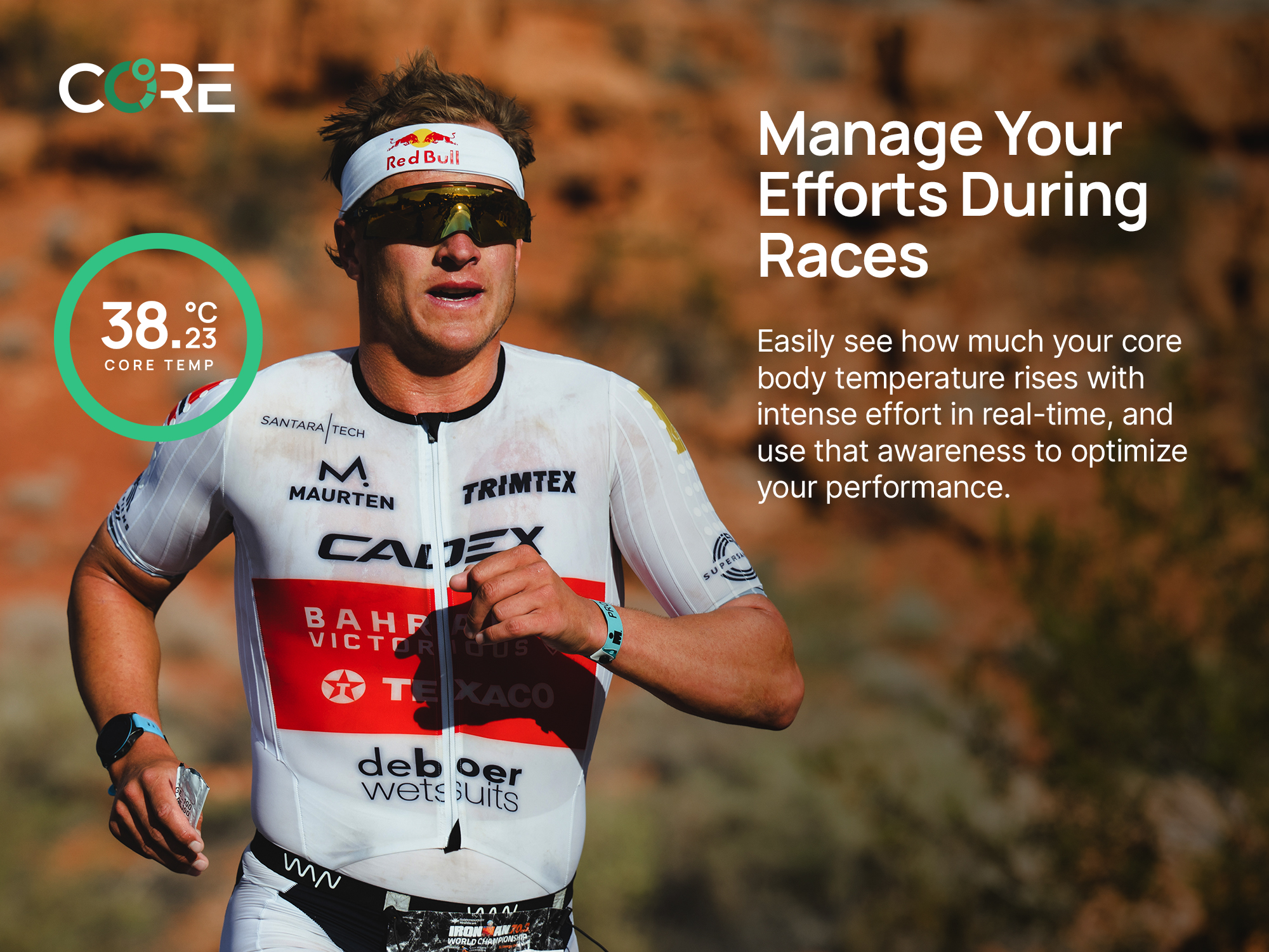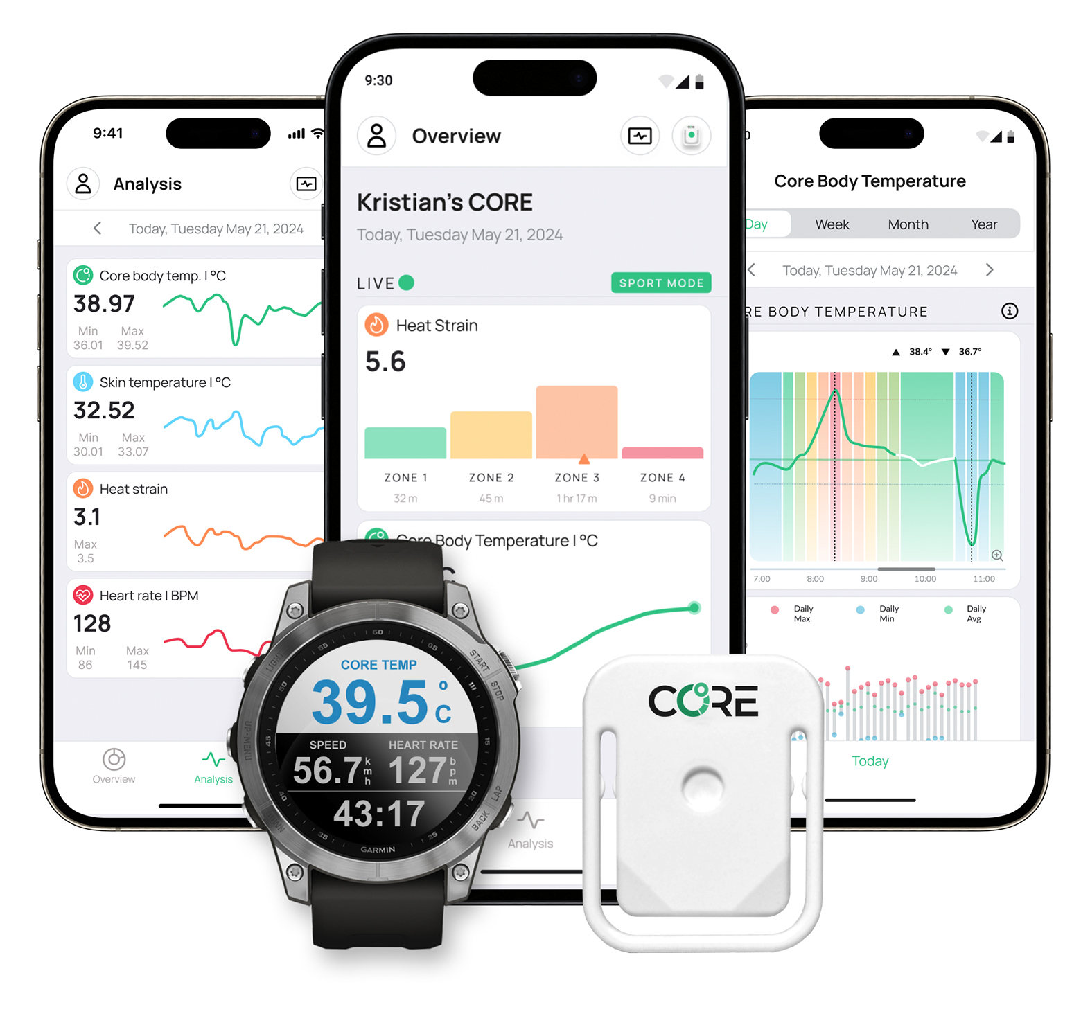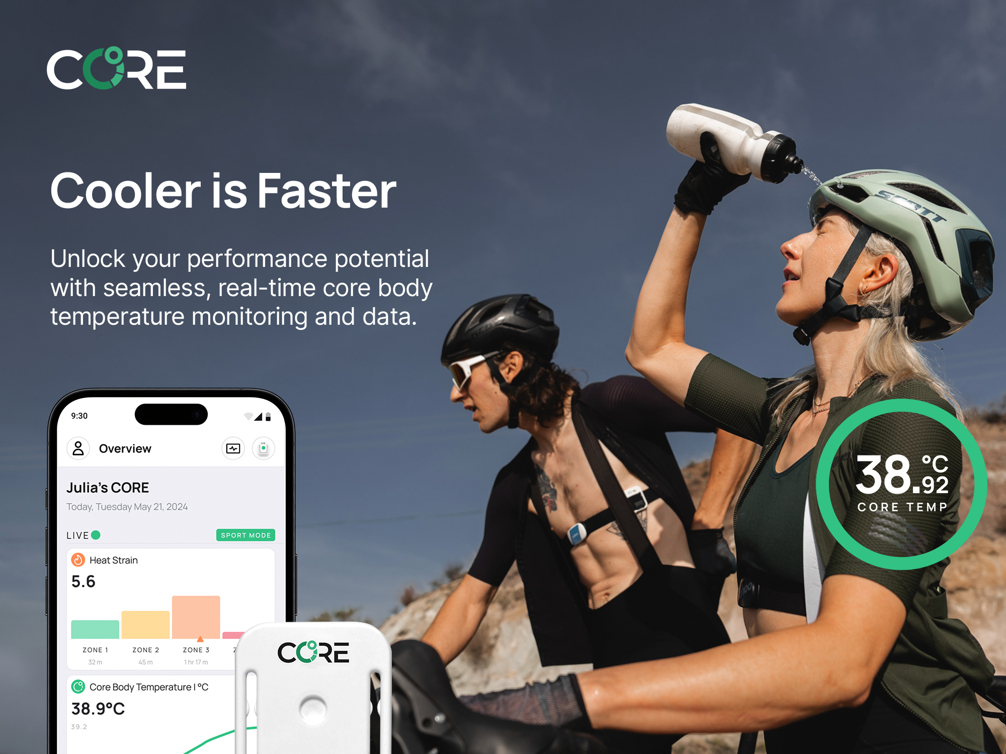 Το CORE είναι ελαφρύ, φοριέται εύκολα με μια ζώνη στήθους ή αυτοκόλλητο και συνδέεται με εφαρμογές ή αθλητικά ρολόγια για άμεση παρακολούθηση. Μέσω της συνεχούς καταγραφής της θερμοκρασίας πυρήνα, δίνει τη δυνατότητα για εξατομικευμένη διαχείριση θερμικού φορτίου και υποστήριξη θερμικής προσαρμογής.