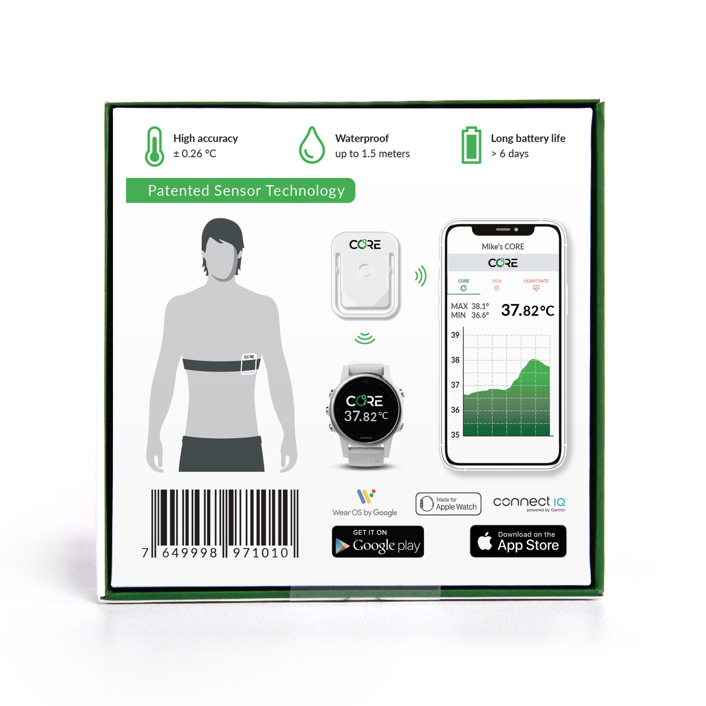 Ο αισθητήρας CORE είναι το μοναδικό μη επεμβατικό σύστημα που μετρά με ακρίβεια τη θερμοκρασία πυρήνα του σώματος σε πραγματικό χρόνο, κατά τη διάρκεια της άσκησης αλλά και της καθημερινότητας. Είναι ιδανικός για αθλητές αντοχής, προπονητές και επαγγελματίες υγείας που θέλουν να κατανοήσουν καλύτερα τις θερμικές αποκρίσεις του σώματος και να βελτιώσουν την απόδοση ή την ασφάλεια στην προπόνηση